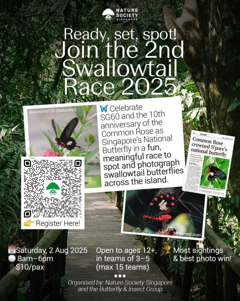 To gear up for the race, please feel free to participate in the upcoming Swallowtail Butterfly Walk on 6 July at the Singapore Botanic Gardens.